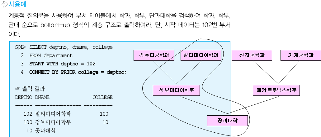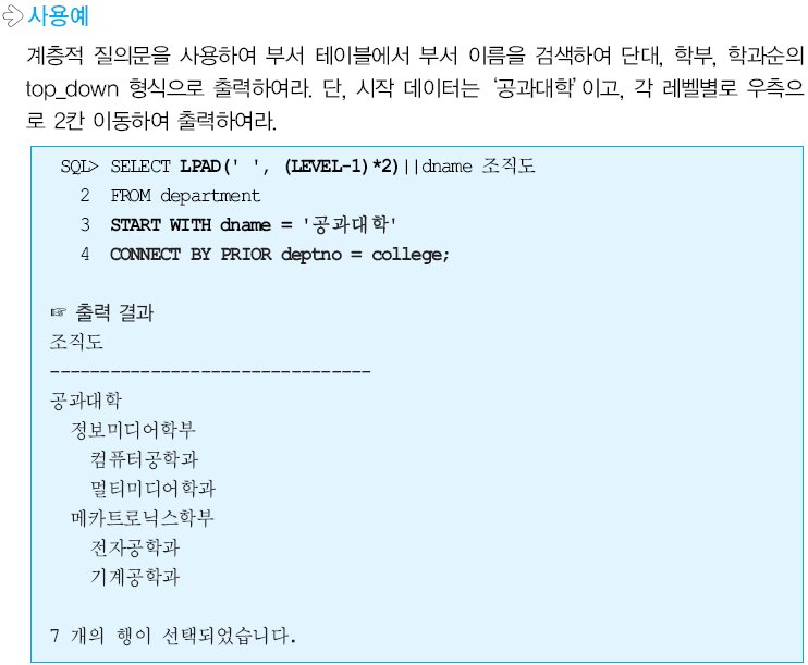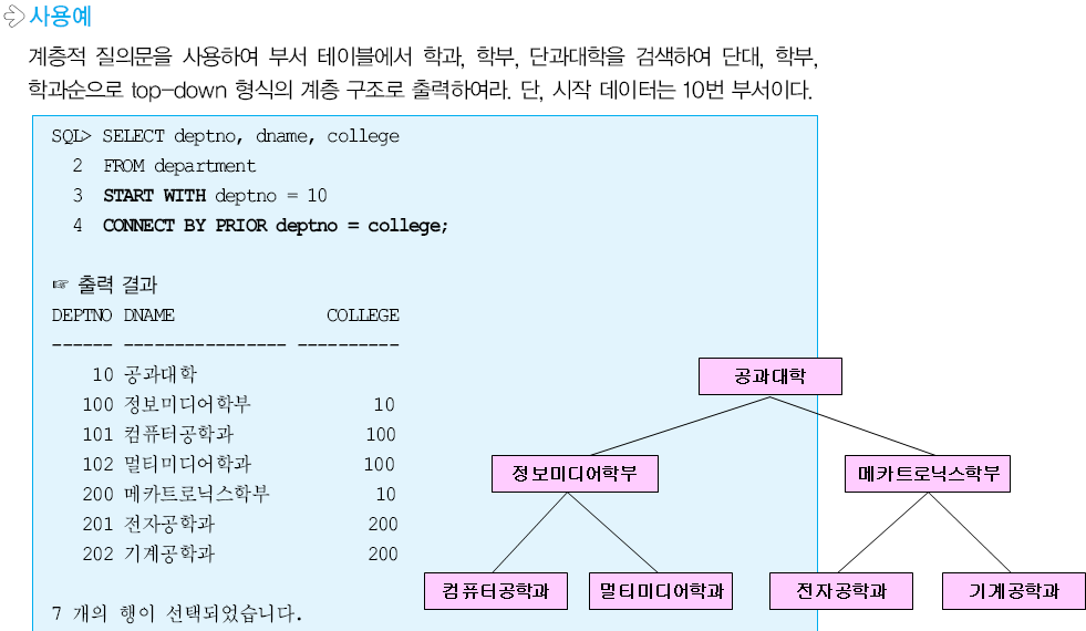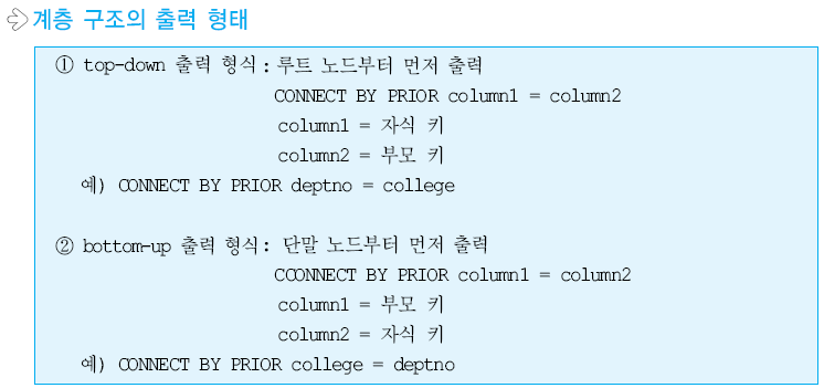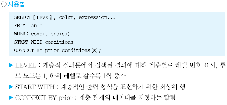 계층적 질의문은 상향식과 하향식으로 이루어져있으며, 2차원 테이블에서 트리구조를 표현할 수 있다고 합니다. 의미가 없어보이고, ANSI 표준이 아니지만 실무에서 사용될 때가 있어 알아두면 유용한 질의라고 합니다.