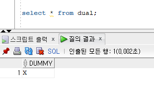 사함수를 실행할 때 임시로 사용하는데 적합합니다. 특히 내장 함수의 쓰임을 알고 싶을 때 특정 테이블 생성할 필요 없이 dual 테이블을 이용하여 함수의 값을 출력할 수 있습니다.