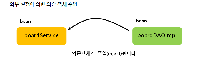 - 클래스의 연관 관계를 개발자가 직접 코딩을 통해 컴포넌트(클래스)에 부여하는 것이 아니라 컨테이너가 연관 관계를 직접 규정하는 것