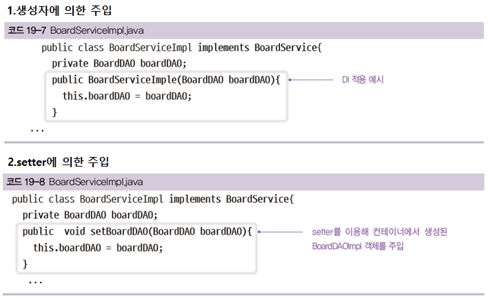 - 기존 구현 방법은 개발자가 직접 코드 안에서 객체의 생성과 소멸을 제어했지만, 의존성 주입은 객체의 생성, 소멸과 객체 간의 의존 관계를 컨테이너가 제어 => 제어의 역전(IoC, Inversion of Control)