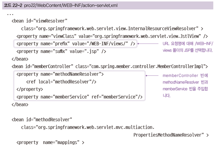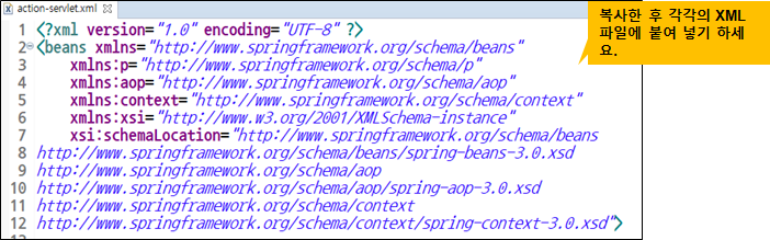 | action-servlet.xml | 스프링에서 필요한 여러가지 빈을 설정합니다. |