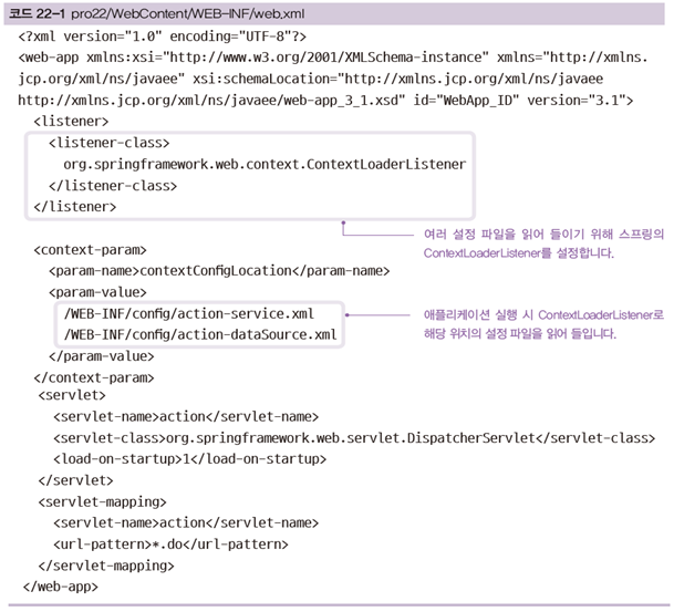 | web.xml | ContextLoaderListener를 이용해 빈 설정 XML 파일들을 읽어 들입니다. |