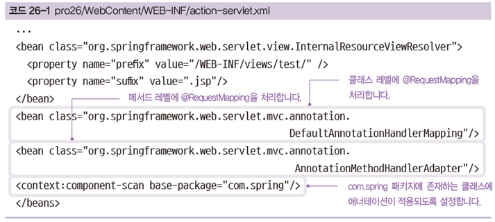| DefaultAnnotationHandlerMapping | 클래스 레벨에서 @RequestMapping을 처리합니다. |