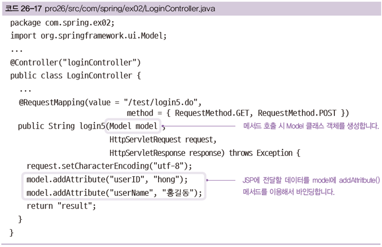 - Model 클래스를 이용하면 메소드 호출 시 JSP로 값을 바로 바인딩하여 전달 가능