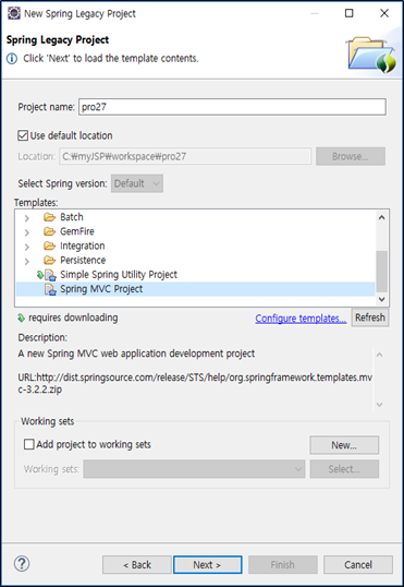 프로젝트 정보가 표시되며 스프링에서 사용되는 여러 가지 라이브러리를 설정해 다운로드 할 수 있음
